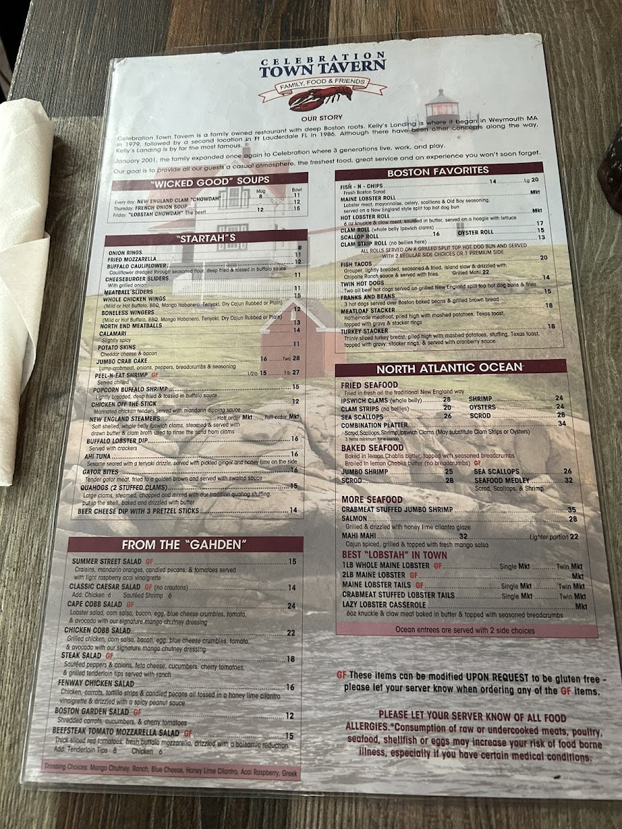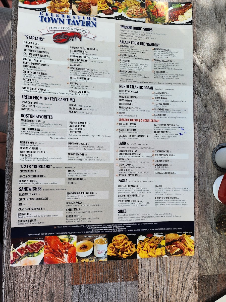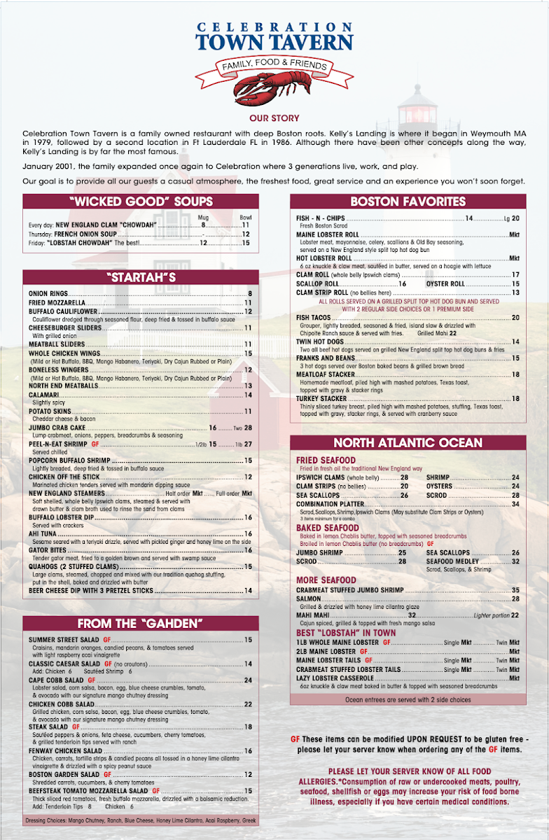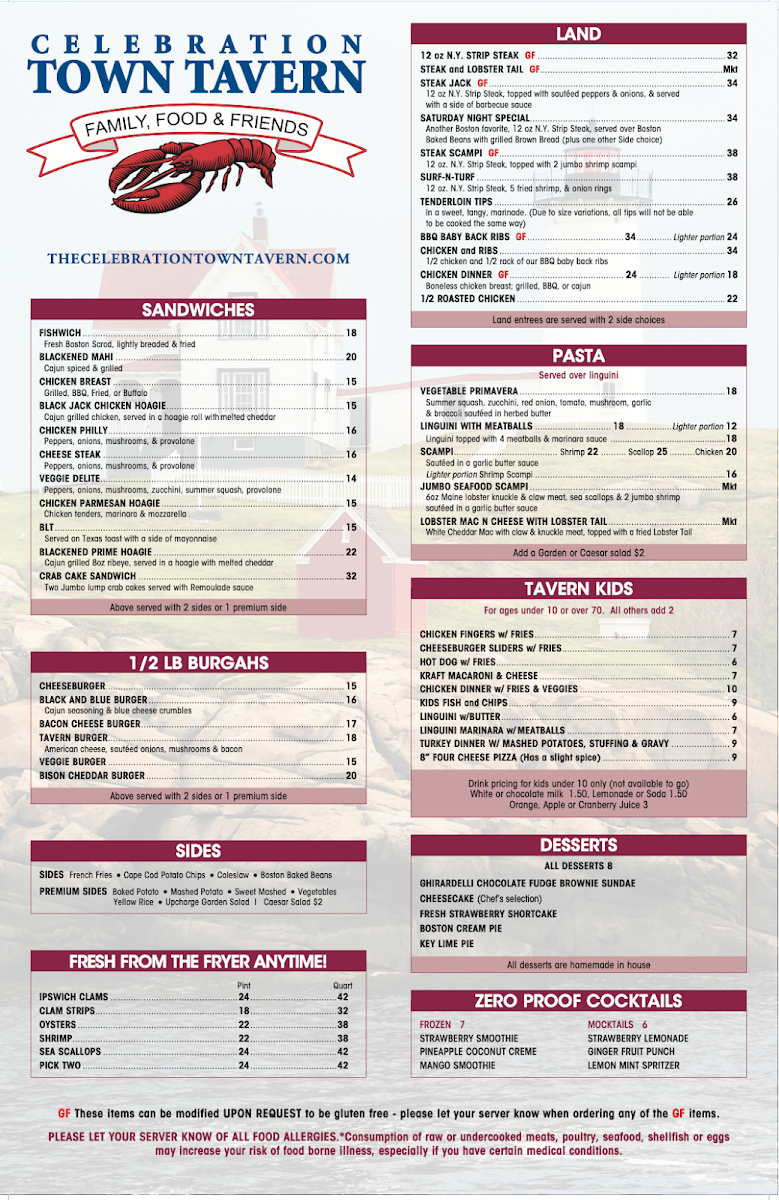 The menu at Celebration Town Tavern offers a comfortable blend of classic American bar and grill fare with a strong nod to fresh seafood favorites. Whether you're stopping by for a casual lunch, gathering for a relaxed dinner, or enjoying drinks with friends, the menu provides satisfying choices that complement the welcoming tavern atmosphere.