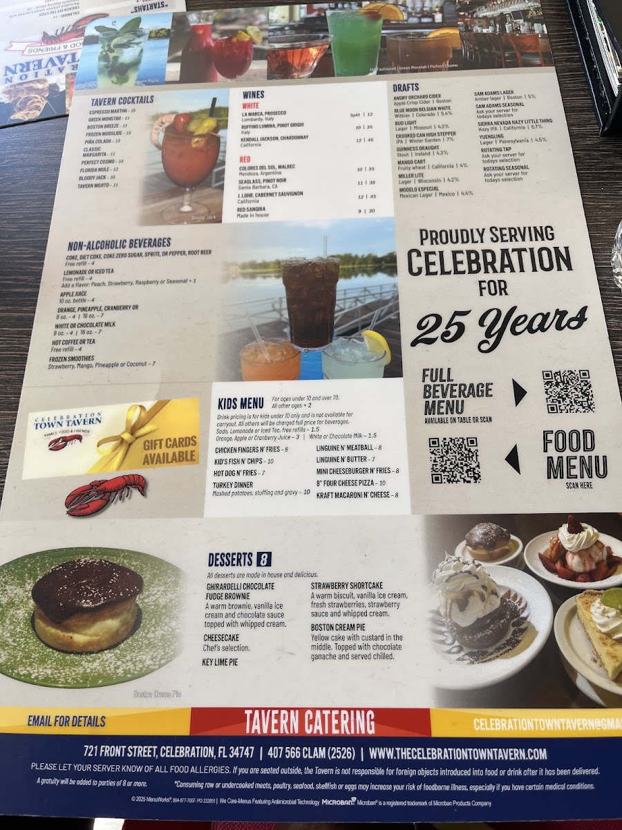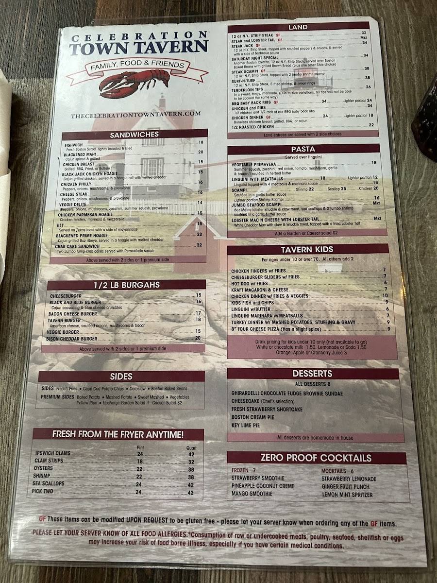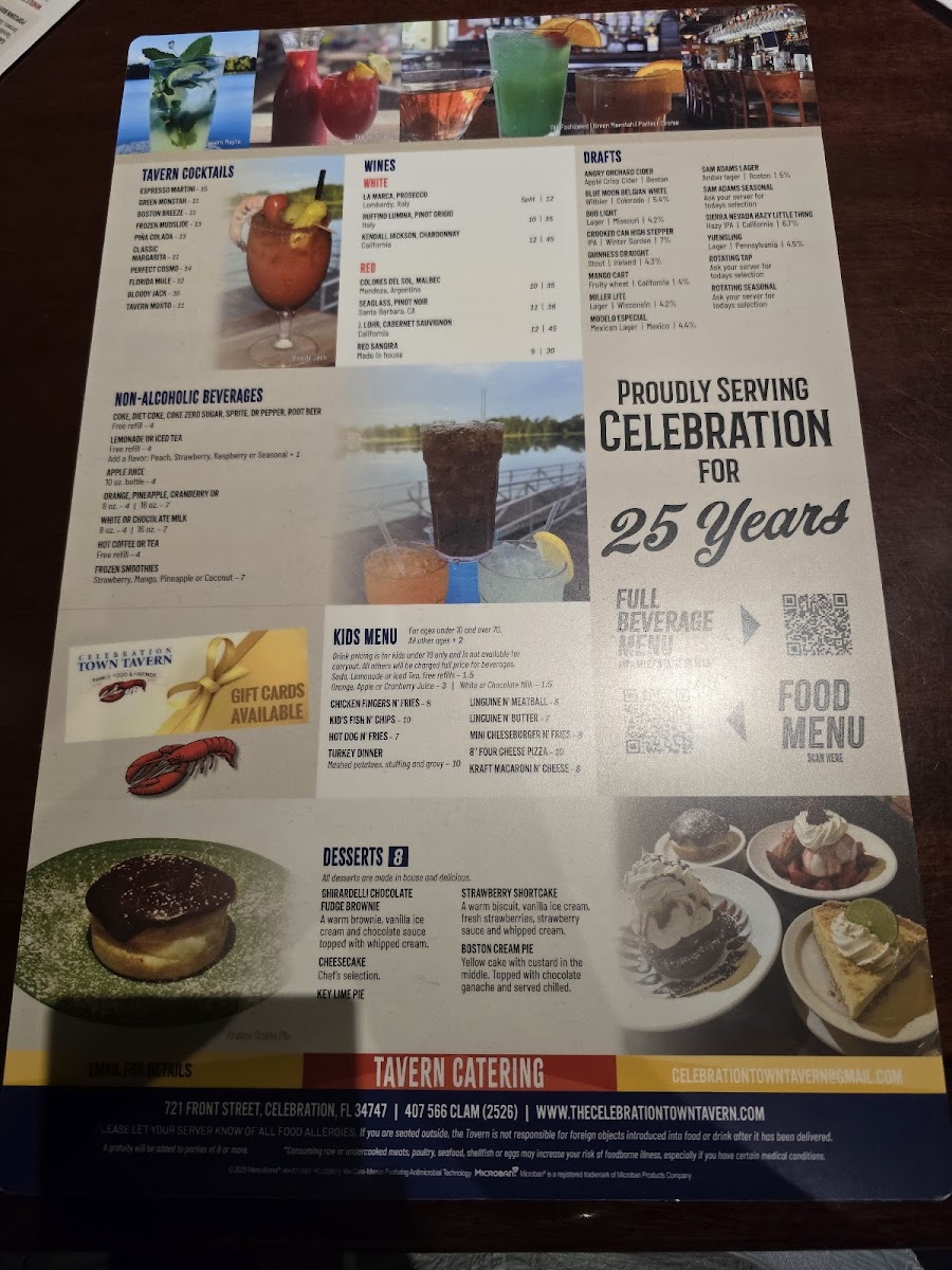 The menu at Celebration Town Tavern offers a comfortable blend of classic American bar and grill fare with a strong nod to fresh seafood favorites. Whether you're stopping by for a casual lunch, gathering for a relaxed dinner, or enjoying drinks with friends, the menu provides satisfying choices that complement the welcoming tavern atmosphere.