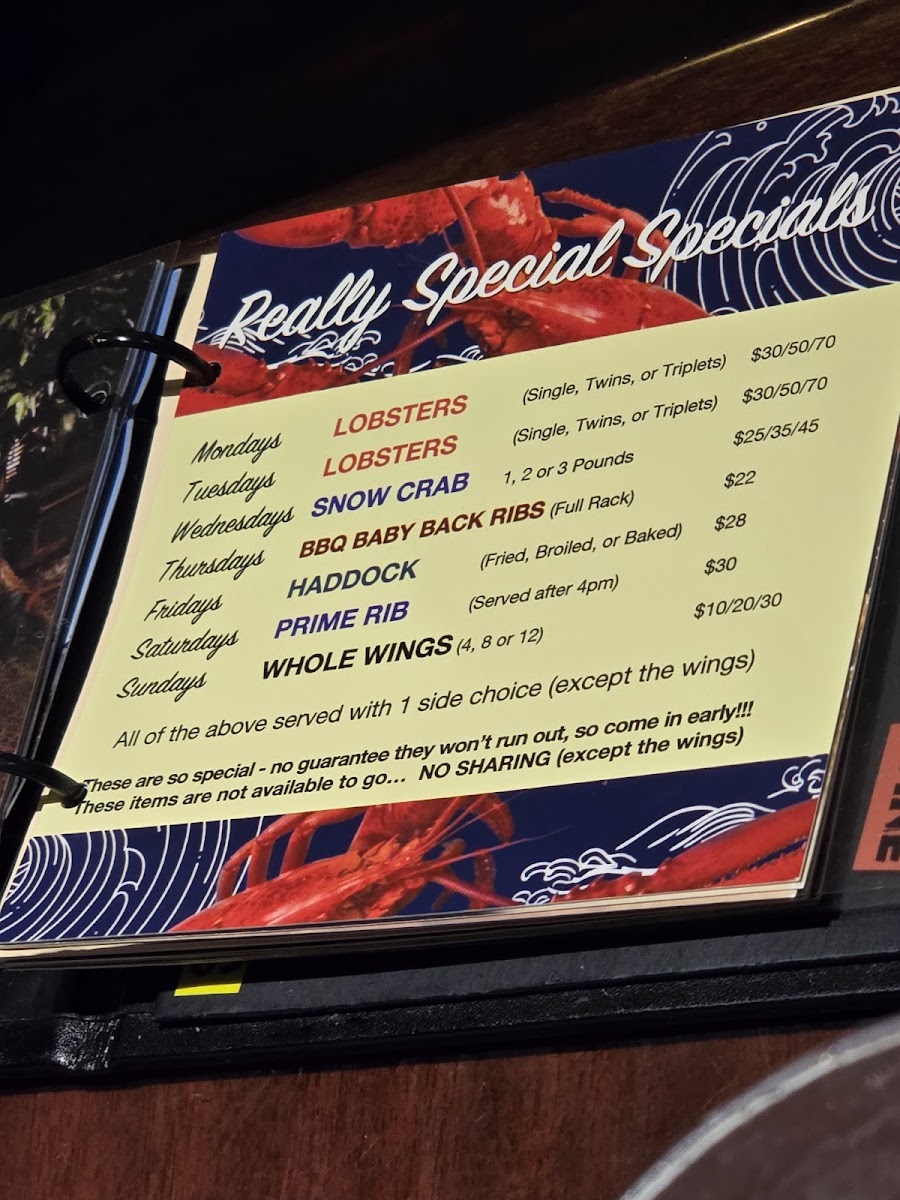 Start your experience with comforting starters like crispy onion rings, flavorful bruschetta, or lightly spicy calamari. The seafood selections, such as the Maine Lobster Roll or the Jumbo Seafood Scampi, bring a touch of coastal freshness and pair well with a cold beverage from the bar. Hearty options like the Steak & Lobster Tail or the Meatloaf Stacker fit well for a leisurely dinner, offering rich, filling flavors in generous portions.